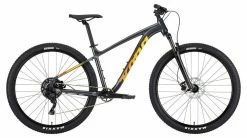Das Kona Lava Dome 29R Mountain Bike ist ausgestattet mit einer Suntour XCR32 Omega Federgabel, einer 9-Gang Kettenschaltung mit Microshift Advent Schaltwerk und einer hydraulischen Tektro HDM275 Scheibenbremse.