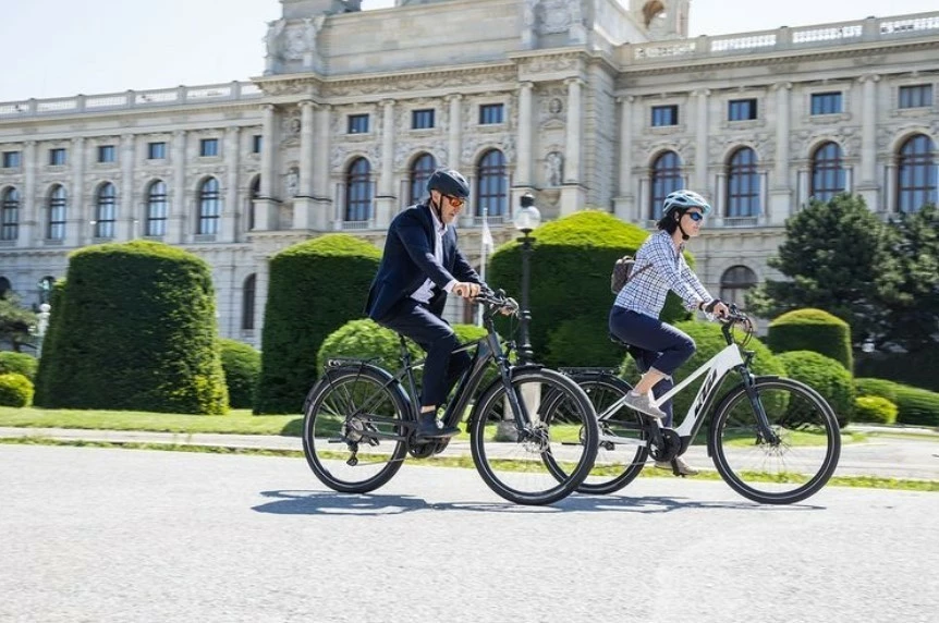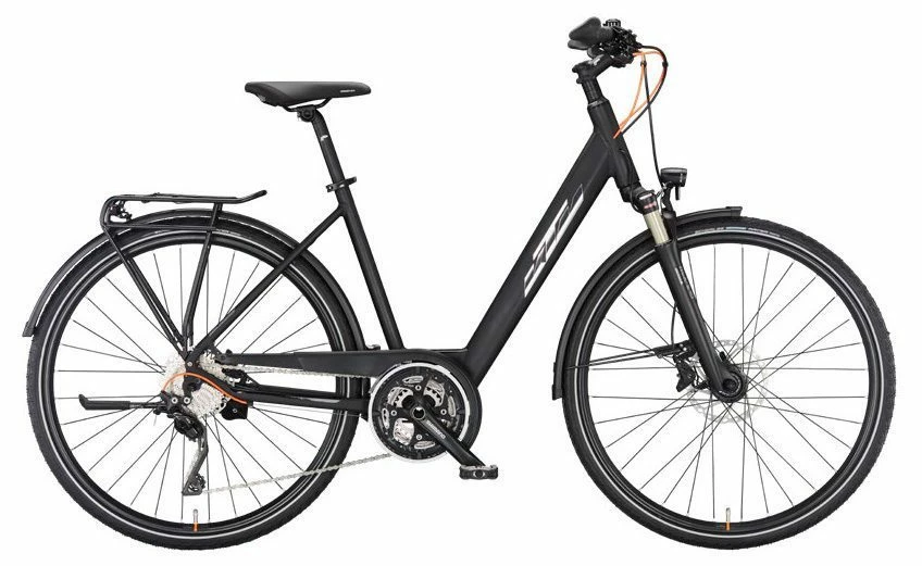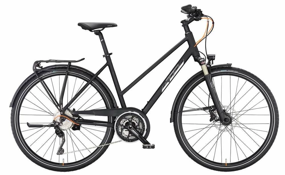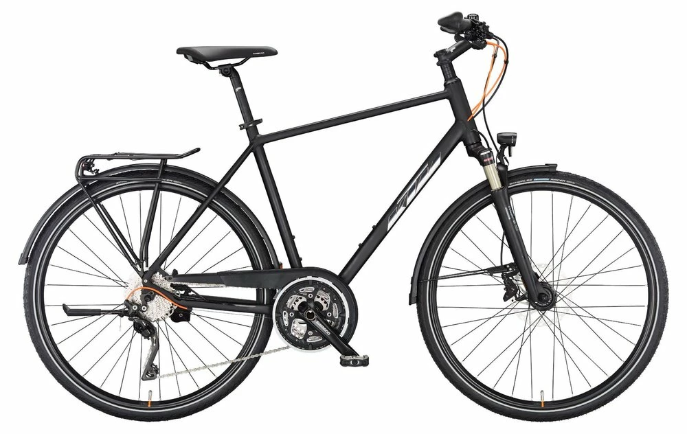 Das KTM Life 1964 Trekking Bike ist ausgestattet mit einer Suntour NCX-E Federgabel, einer 30-Gang Kettenschaltung mit Shimano Deore XT Schaltwerk und einer hydraulischen Shimano MT402/MT410 Scheibenbremse.