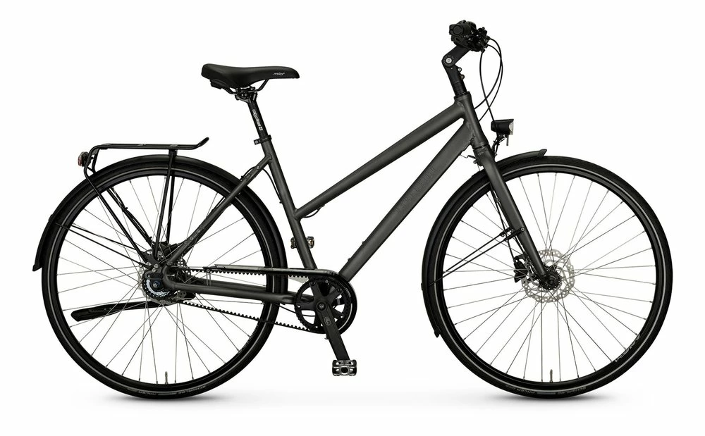 Das Rabeneick TS5 ist ausgestattet mit einer 8-Gang Shimano Nexus Nabenschaltung mit Freilauffunktion, Gates Riemenantrieb, einer Aluminium Starrgabel und einer Shimano BR-MT200 Scheibenbremse.