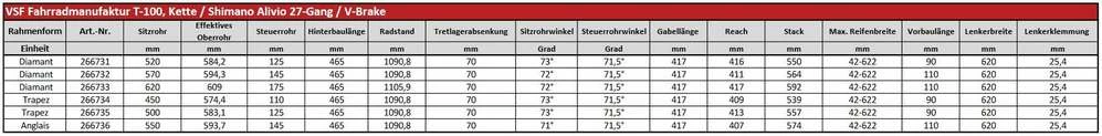 Das vsf fahrradmanufaktur T-100 ist ausgestattet mit einer vsf fahrradmanufaktur CroMo Starrgabel, einer Shimano Alivio Felgenbremse und einer 27-Gang Kettenschaltung mit Shimano Alivio RD-T4000 Schaltwerk.